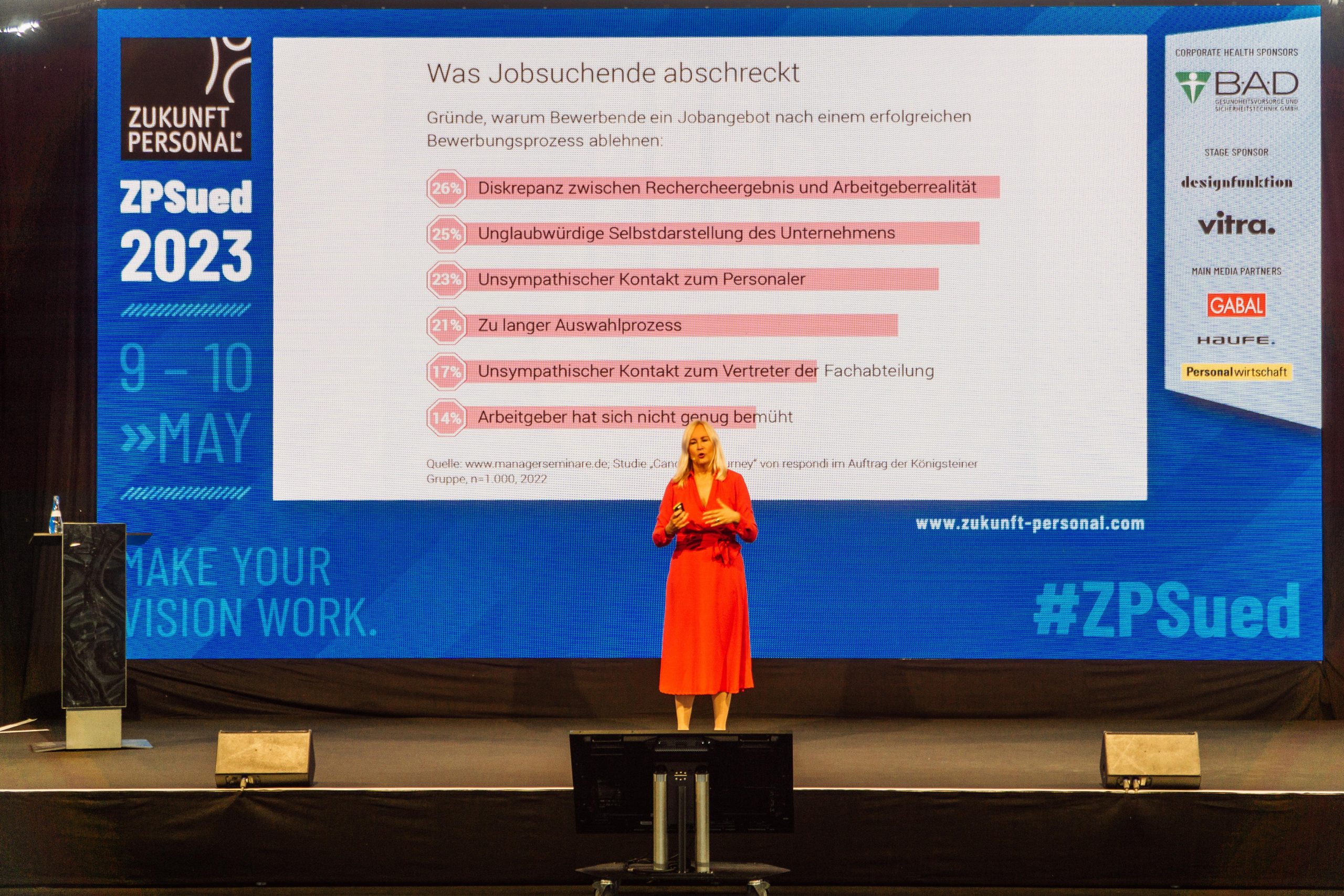 Weiter ging der berufliche Weg für die erfolgreiche HR-Expertin in der Reisebranche. Als Personalleiterin war sie für 400 Mitarbeiter international verantwortlich. Dann ein harter Rückschlag – 9/11 und kurze Zeit später der Stellenabbau. Eine Veränderung folgte auf die nächste, die Rednerin erlebte ihren ganz persönlichen Change. Vom Hoch als HR-Führungskraft war es ein tiefer emotionaler Fall, über Insolvenz, Stellenabbau, Abfindungen und Kündigungen zu sprechen. Vor ihrer Selbstständigkeit wechselte die HR-Expertin als leitende Führungskraft noch einmal das Unternehmen und sammelte weitere Erfahrungen in großen Changeprojekten.